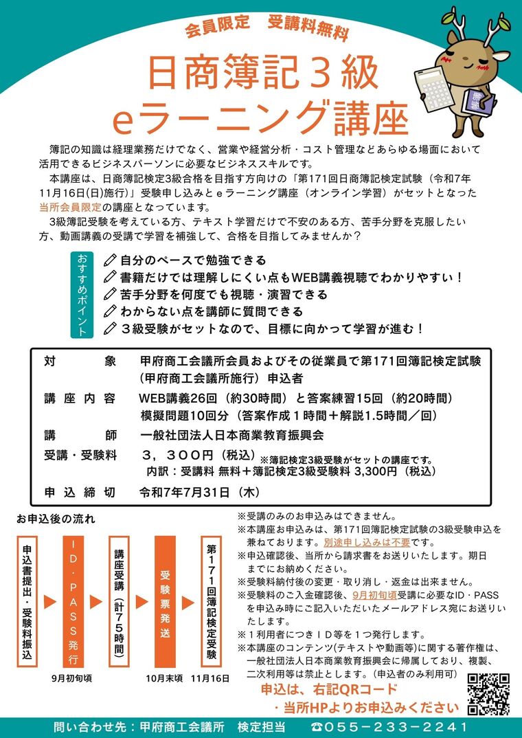 本講座は、日商簿記検定3級合格を目指す方向けの「第171回日商簿記検定試験(令和7年11月16日(日)施行)」受験申し込みとeラーニング講座(オンライン学習)がセットとなった当所会員様限定の講座となっています。