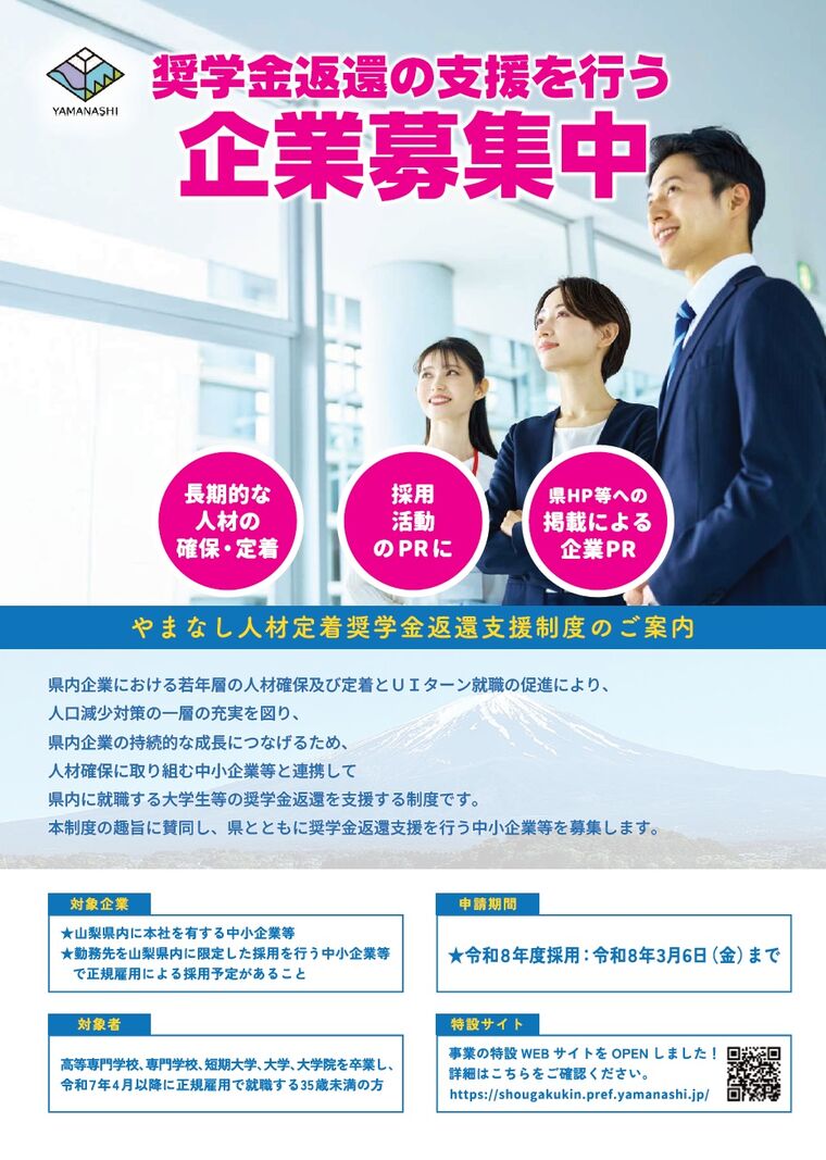 山梨県では、県内企業における若年層の人材確保及び定着とUIターン就職の促進により、人口減少対策の一層の充実を図り、県内企業の持続的な成長につなげるため、人材確保に取り組む中小企業者と連携して、県内に就職する大学生等の奨学金返還を支援する奨学金返還支援制度を設けています。