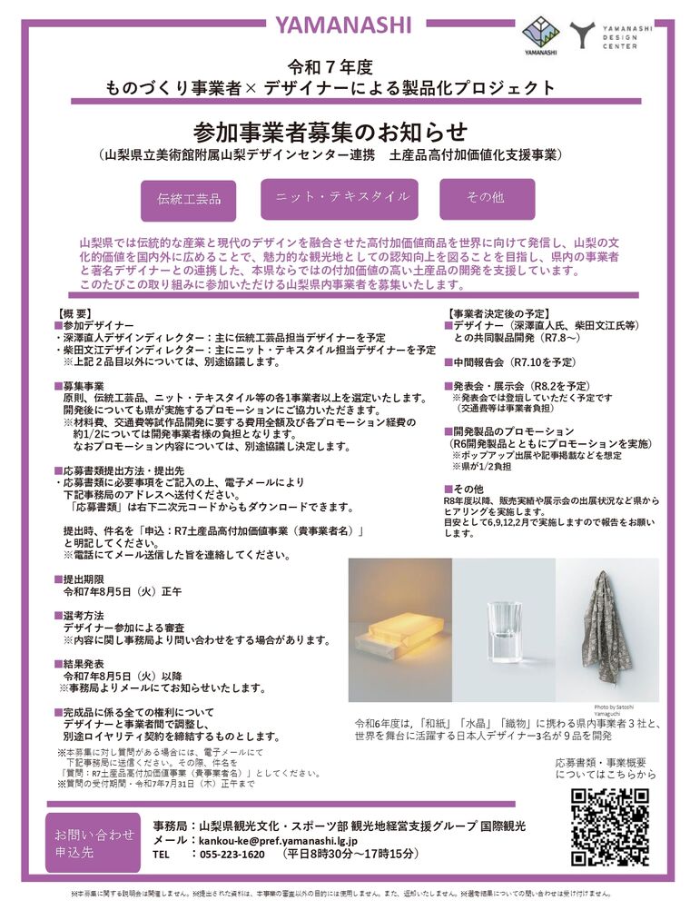 【山梨県】土産品高付加価値化支援事業 令和7年度「ものづくり事業者✖デザイナーによる製品化プロジェクト」事業者募集について