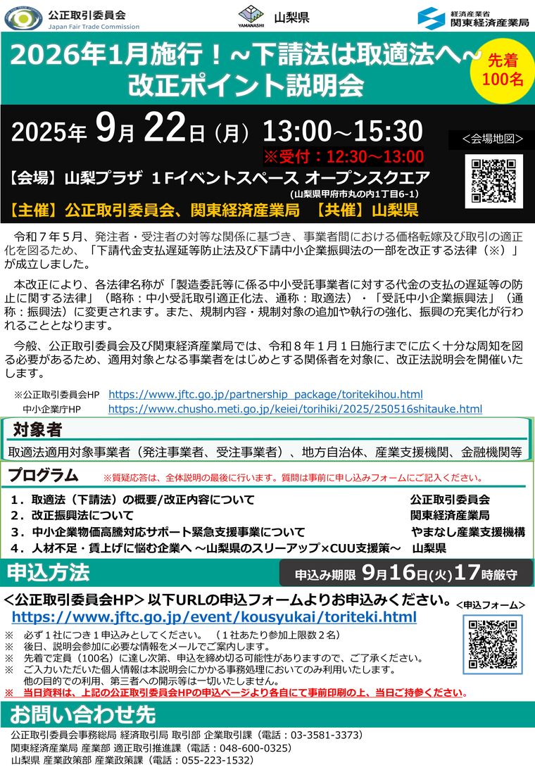 (共催:山梨県)問合せ先 公正取引委員会 事務総局取引部 企業取引課 TEL:03-3581-3373