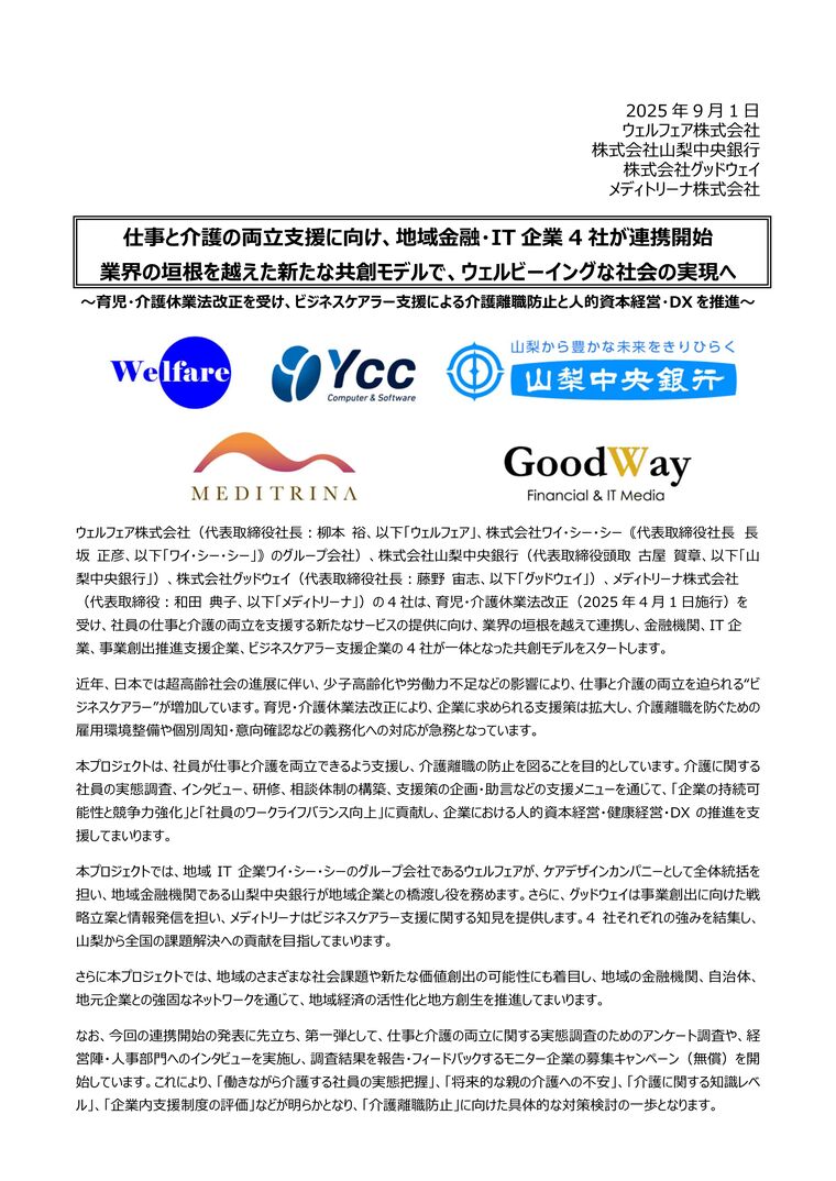 ウェルフェア株式会社(代表取締役社⾧:柳本裕、以下「ウェルフェア」、株式会社ワイ・シー・シー⦅代表取締役社⾧⾧坂正彦、以下「ワイ・シー・シー」⦆のグループ会社)、株式会社山梨中央銀行(代表取締役頭取古屋賀章、以下「山梨中央銀行」)、株式会社グッドウェイ(代表取締役社⾧:藤野宙志、以下「グッドウェイ」)、メディトリーナ株式会社(代表取締役:和田典子、以下「メディトリーナ」)の4社は、育児・介護休業法改正(2025年4月1日施行)を受け、社員の仕事と介護の両立を支援する新たなサービスの提供に向け、業界の垣根を越えて連携し、金融機関、IT企業、事業創出推進支援企業、ビジネスケアラー支援企業の4社が一体となった共創モデルをスタートします。