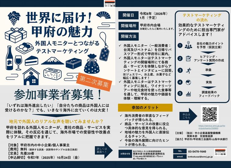 【二次募集中!】世界に届け!甲府の魅力 外国人モニターとつながるテストマーケティング【中小企業基盤整備機構】