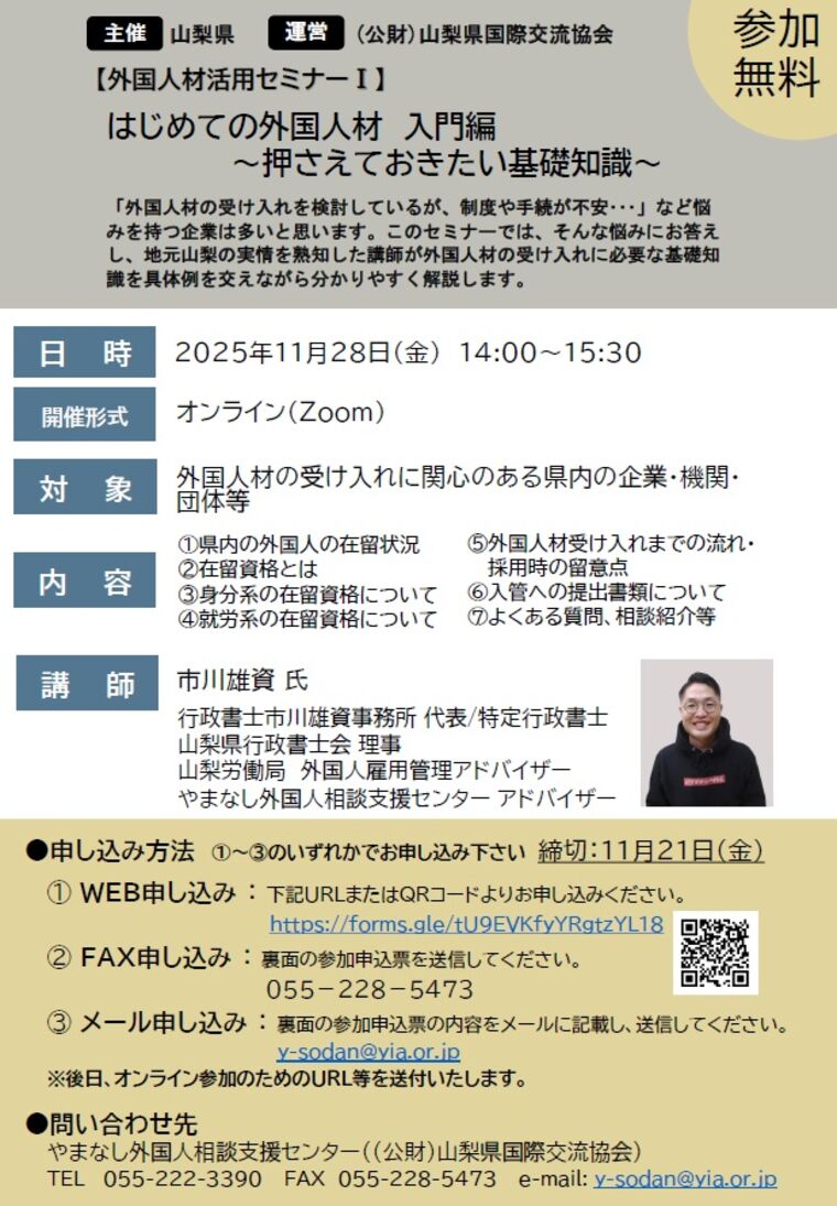 【山梨県】《外国人材活用セミナーⅠ》「はじめての外国人材入門編」開催のご案内