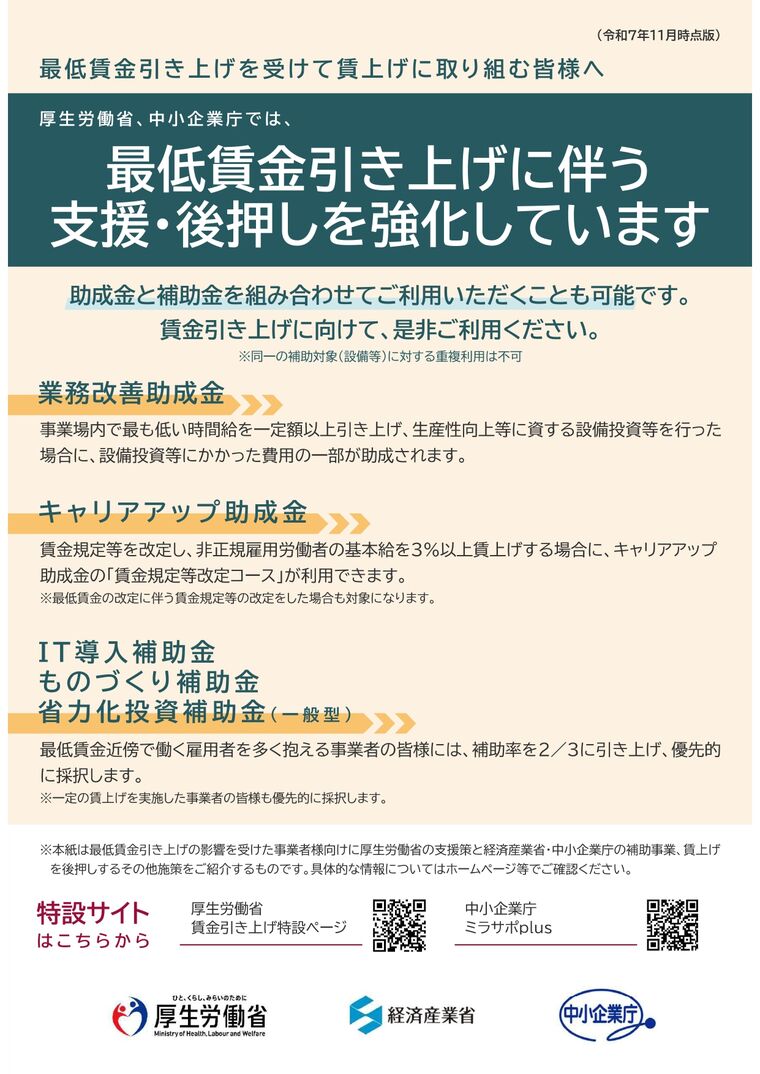 最低賃金引き上げの影響を受けた事業者様向けに厚生労働省の支援策と経済産業省・中小企業庁の補助事業、賃上げを後押しするその他施策を紹介するパンフレットです。具体的な情報についてはホームページ等でご確認ください。