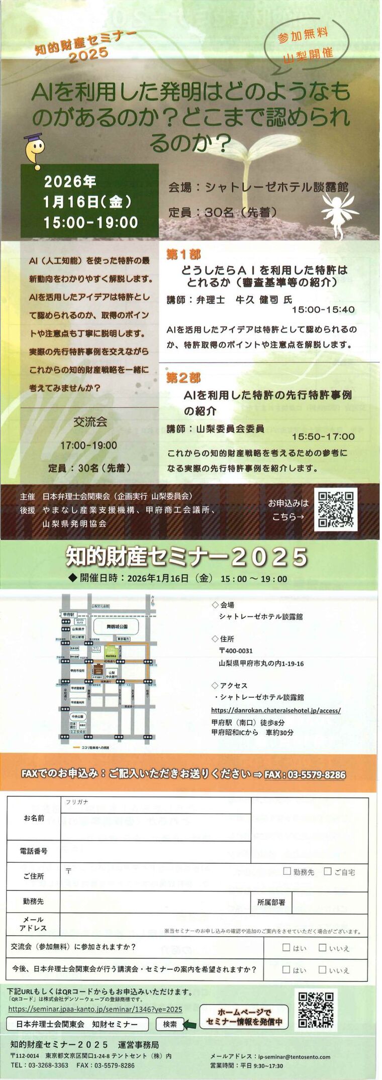 【日本弁理士会関東会】知的財産セミナー2025「AIを利用した発明はどのようなものがあるのか?どこまで認められるのか?」の開催について