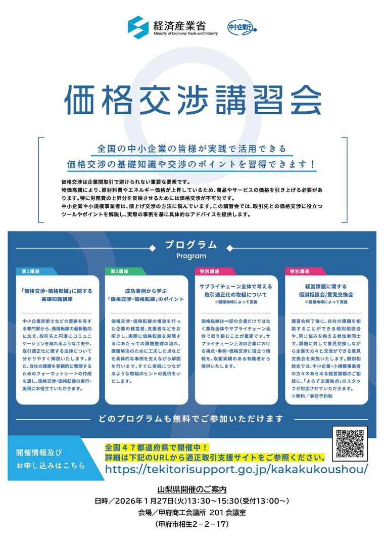 中小企業診断士などの資格を有する専門家や、企業の経営者や支援者を講師に、中小企業が取引先に価格交渉をする際に必要となる知識、ノウハウについて具体的な事例を交えた解説があります。また、自社の課題に対してよろず支援拠点の相談員に相談できる個別相談会が実施されます。