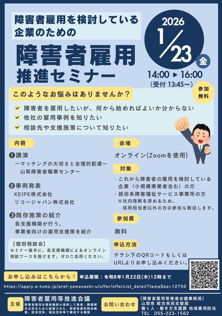 障害者雇用等推進会議(事務局:山梨県)では、障害者雇用を考えている企業のための手順や既存の施策等を知ってもらう機会として「障害者雇用推進セミナー」を開催します。山梨県内で積極的に障害者の受入れを行う企業の事例発表、オンライン相談ブースでの個別相談会も実施予定です。是非ご参加ください。