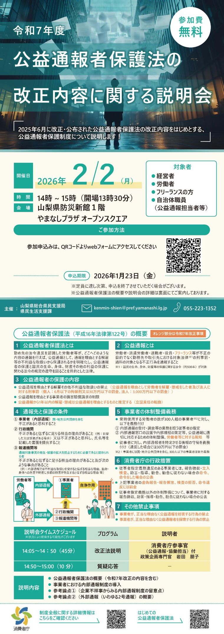 日時 2026年2月2日(月曜日)14時00分~15時00分(開場13時30分) 会場 山梨県防災新館1階 やまなしプラザ オープンスクエア 対象者 経営者、労働者、フリーランスの方、自治体職員(公益通報担当者等) 参加費 無料 申込方法 【参加申込フォーム】からお申込みください 〆切 2026年1月23日(金) 問合せ先 山梨県総合県民支援局 県民生活支援課