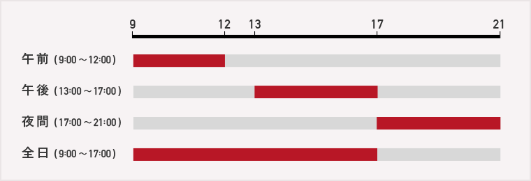 午前 9:00〜12:00 午後 13:00〜17:00 夜間 17:00〜21:00 全日 9:00〜17:00