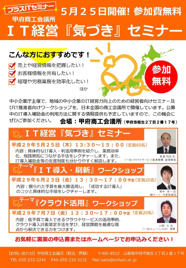 日時 2017-05-25 13:30~16:30 (終了) 場所 甲府商工会議所 201会議室 講師 (一社)クラウドサービス推進機構 副理事長 高島 利尚 氏
