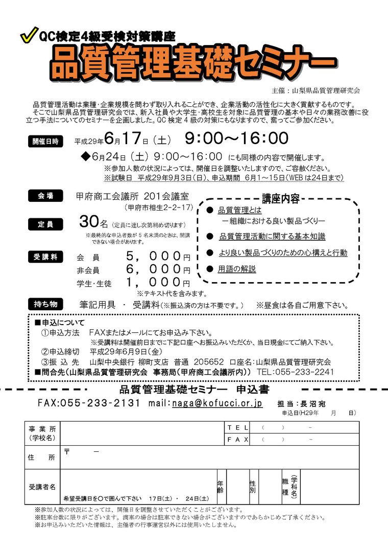 日時 2017-06-17 9:00~16:00 (終了) 場所 甲府商工会議所 講師 未定 参加費 会員5,000円、非会員6,000円、学生・生徒1,000円 分野 品質管理 申し込み方法 申し込みフォーム、または資料の申込書を郵送・FAXにてお送りください。