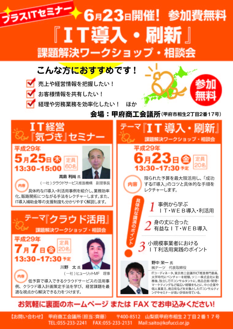 日時 2017-06-23 13:30~17:00 (終了) 場所 甲府商工会議所 講師 野中 栄一 氏 参加費 無料 分野 IT 申し込み方法 申し込みフォーム、または資料裏面の申込書を郵送・FAXにてお送りください。