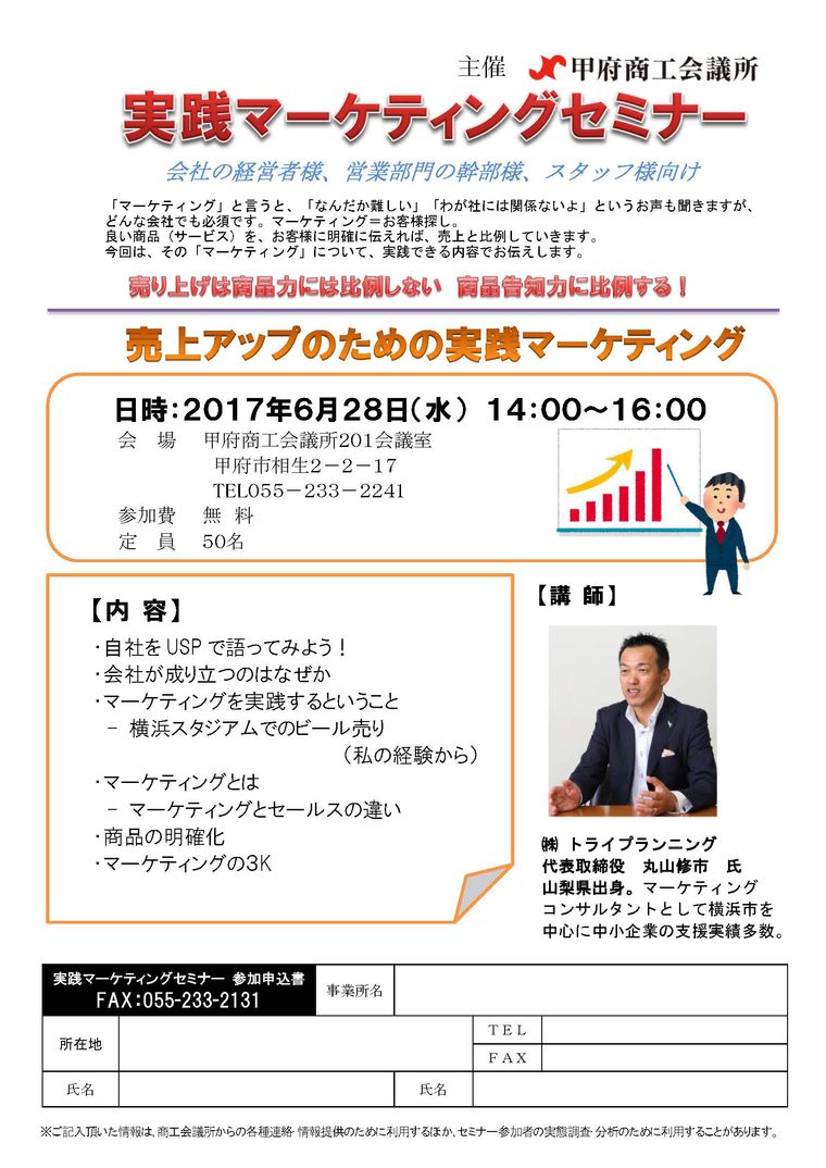 日時 2017-06-28 14:00~16:00 (終了) 場所 甲府商工会議所 201会議室 講師 (株)トライプランニング 代表取締役 丸山 修市 氏 参加費 無料 分野 経営 申し込み方法 申し込みフォーム、または資料の申込書を郵送・FAXにてお送りください。