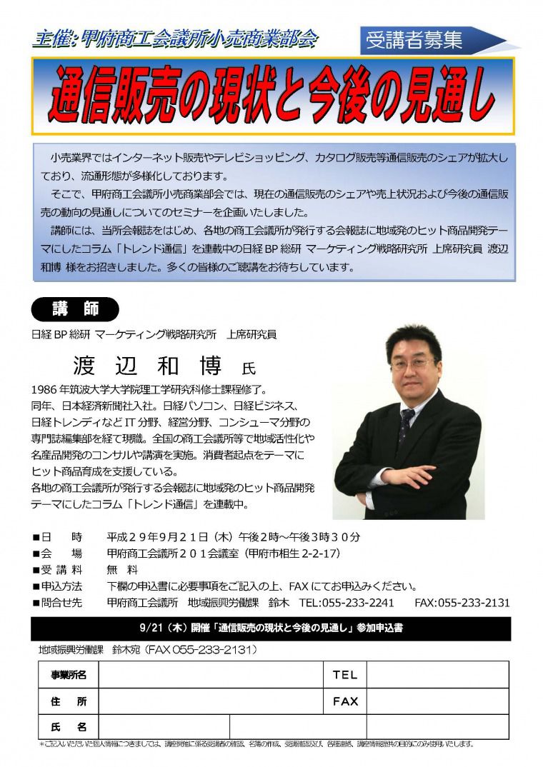 そこで、甲府商工会議所小売商業部会では、現在の通信販売のシェアや売上状況および今後の通信販売の動向の見通しについてのセミナーを企画いたしました。