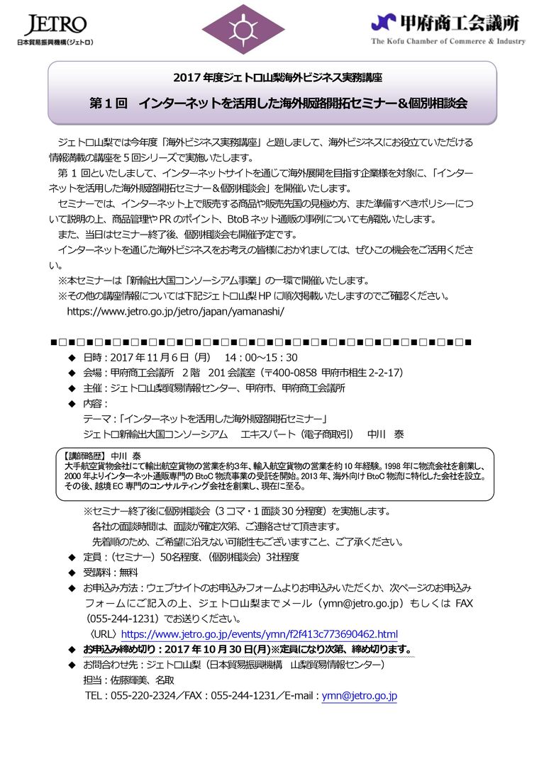 日時 2017-11-6 14:00~15:30 (終了) 場所 甲府商工会議所 2階 201会議室 講師 ジェトロ新輸出大国コンソーシアム エキスパート(電子商取引) 中川 泰 氏 参加費 無料 分野 海外取引 申し込み方法 お問い合わせ