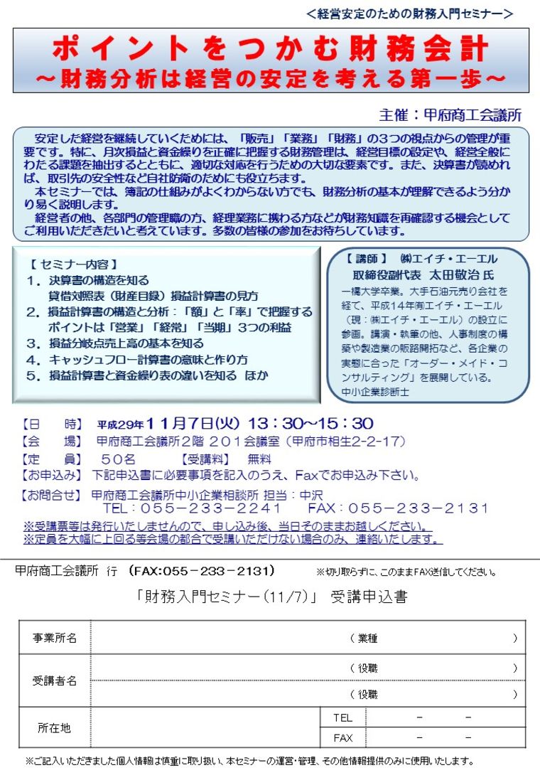日時 2017-11-7 13:30~15:30 (終了) 場所 甲府商工会議所 2階 201会議室 講師 ㈱エイチ・エーエル 取締役副代表 太田 敬治氏 参加費 無料 分野 経営 申し込み方法 資料の申込書を郵送またはFAXにてお送りください。