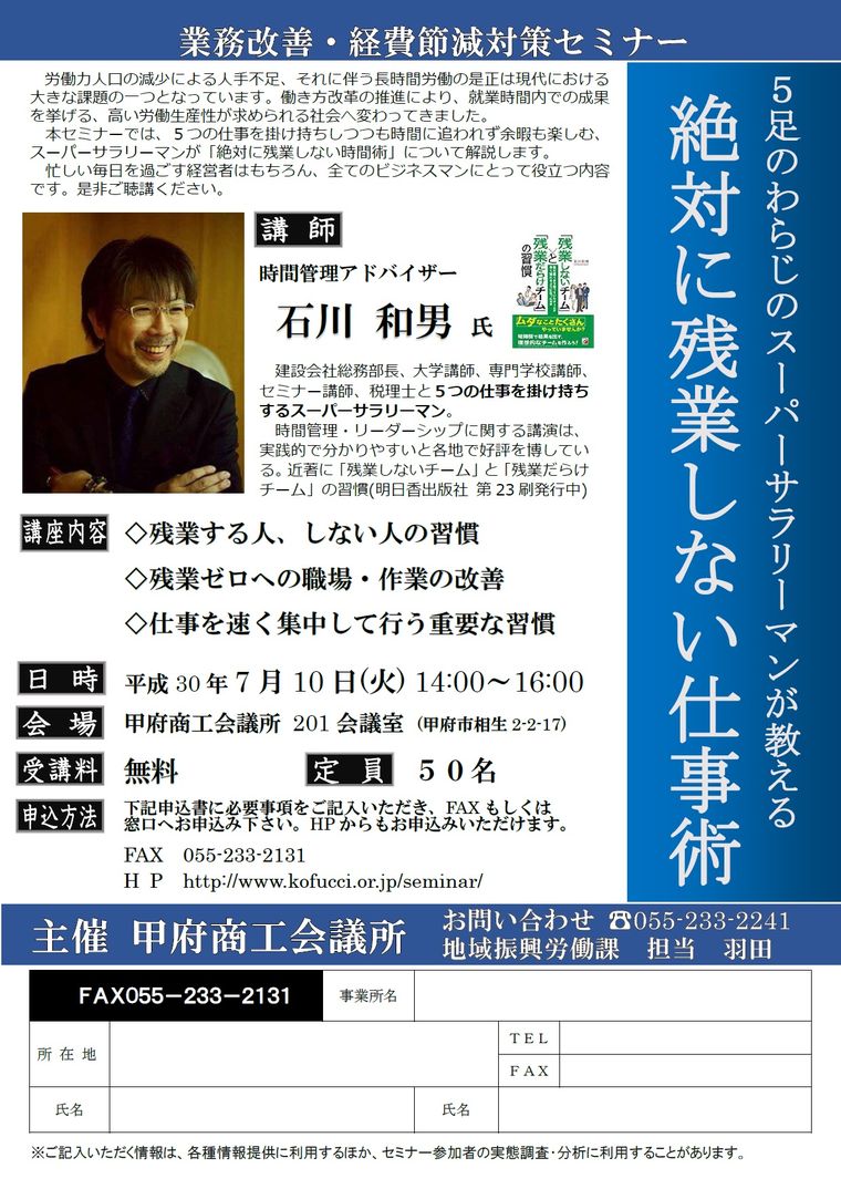 日時 2018-07-10 14:00~16:00 (終了) 場所 甲府商工会議所 講師 時間管理アドバイザー 石川 和男 氏 参加費 無料 分野 業務改善 申し込み方法 申し込みフォーム、または資料の申込書を郵送・FAXにてお送りください。