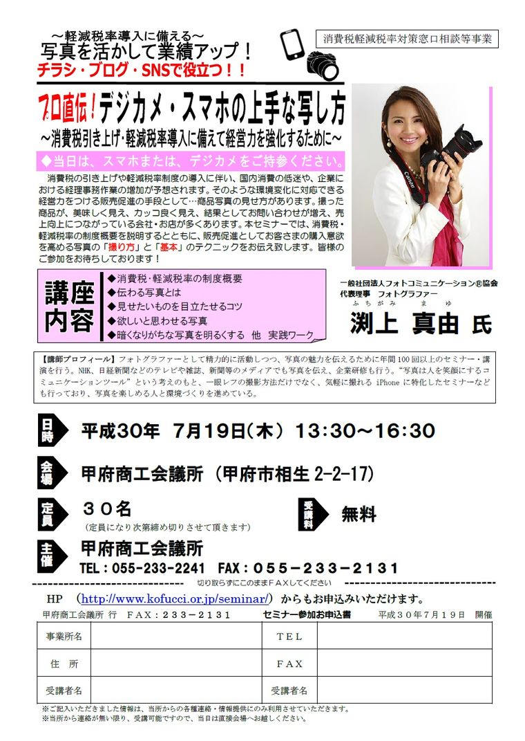 日時 2018-07-19 13:30~16:30 (終了) 場所 甲府商工会議所 講師 一般社団法人フォトコミュニケーション®協会 代表理事