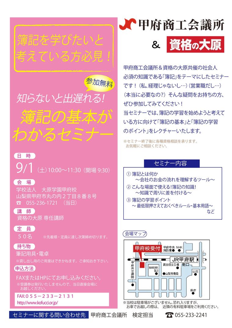 甲府商工会議所&資格の大原共催の社会人必須の知識である「簿記」をテーマにしたセミナーです! ( 私、経理じゃないし…)(営業職だし…)(本当に必要なの?) そんな疑問をお持ちの方、ぜひ参加してみてください !