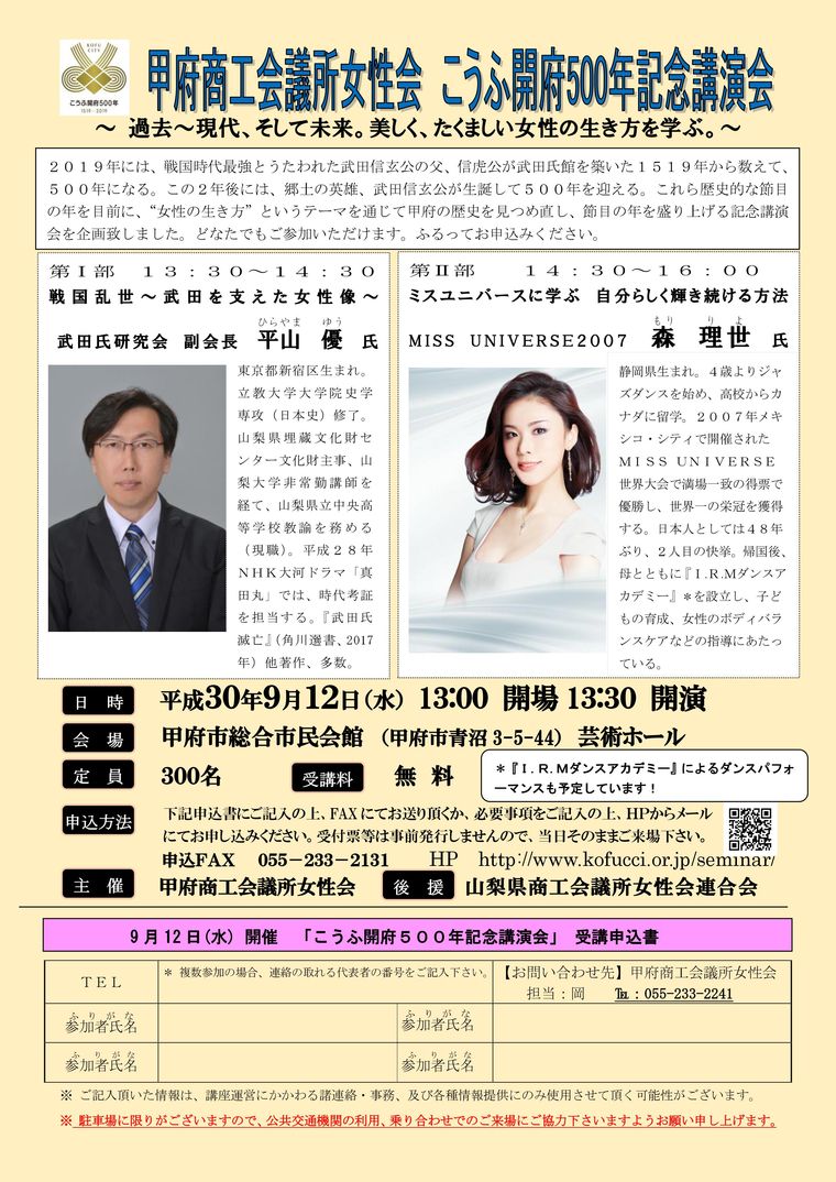 2019年には、戦国時代最強とうたわれた武田信玄公の父、信虎公が武田氏館を築いた1519年から数えて、500年になる。この2年後には、郷土の英雄、武田信玄公が生誕して500年を迎える。これら歴史的な節目の年を目前に、“女性の生き方”というテーマを通じて甲府の歴史を見つめ直し、節目の年を盛り上げる記念講演会を企画致しました。どなたでもご参加いただけます。ふるってお申込みください。