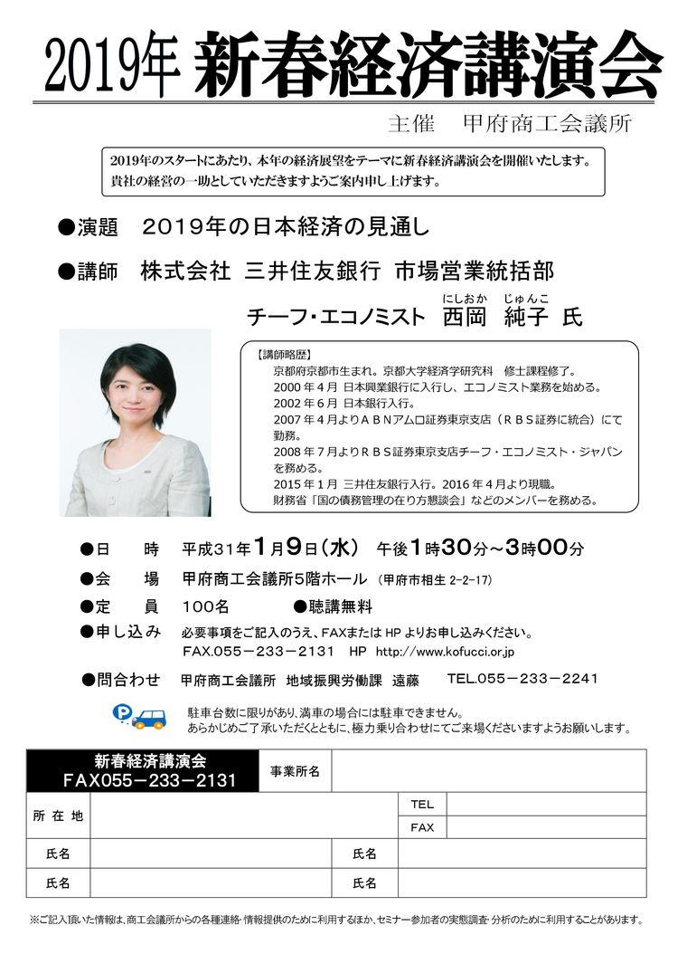 日時 2019-01-09 13:30~15:00 (終了) 場所 甲府商工会議所5F多目的ホール 講師 ㈱三井住友銀行 市場営業統括部 チーフ・エコノミスト 西岡 純子 氏 参加費 無料 分野 経済 申し込み方法 申し込みフォーム、または資料の申込書を郵送・FAXにてお送りください。