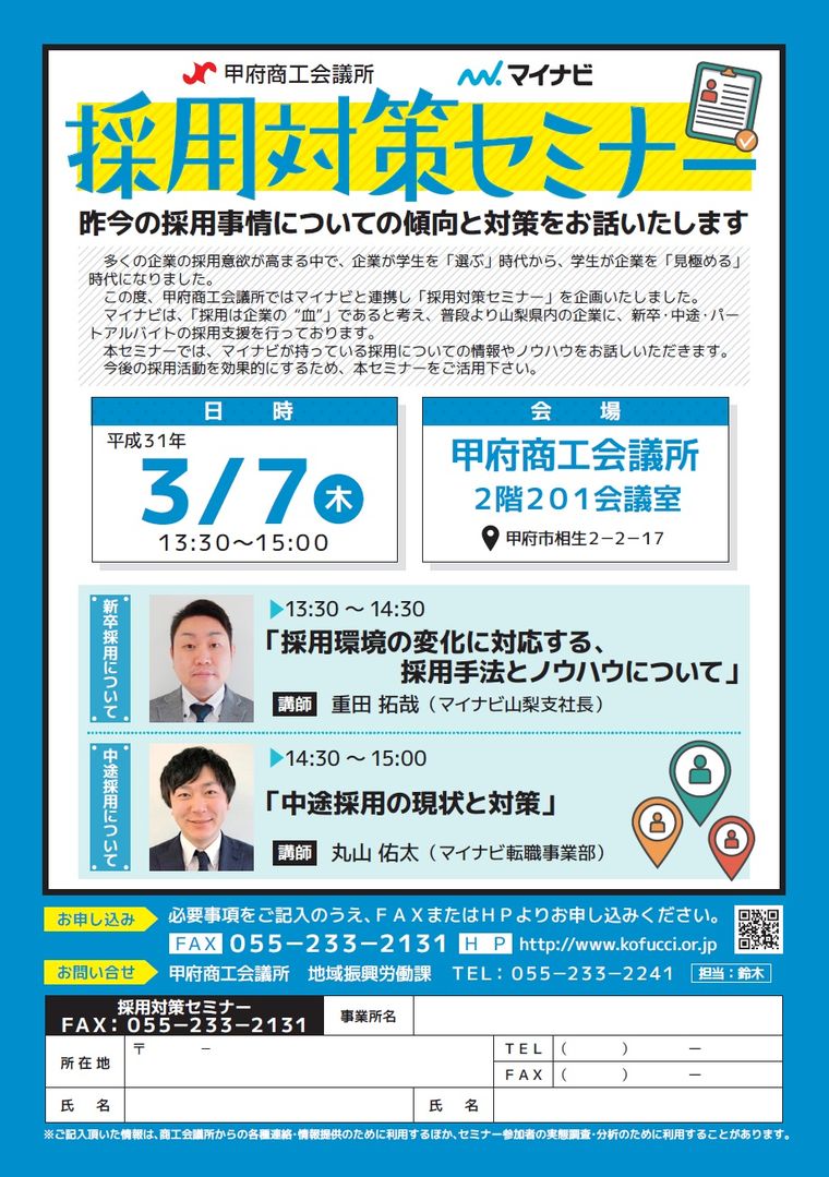 この度、甲府商工会議所ではマイナビと連携し「採用対策セミナー」を企画いたしました。