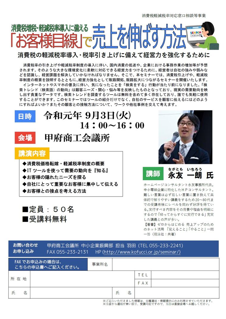 日時 2019-09-03 14:00~16:00 (終了) 場所 甲府商工会議所 講師 ホームページコンサルタント永友事務所 代表 永友 一朗 氏 参加費 無料 分野 販売促進 申し込み方法 申し込みフォーム、または資料の申込書を郵送・FAXにてお送りください。
