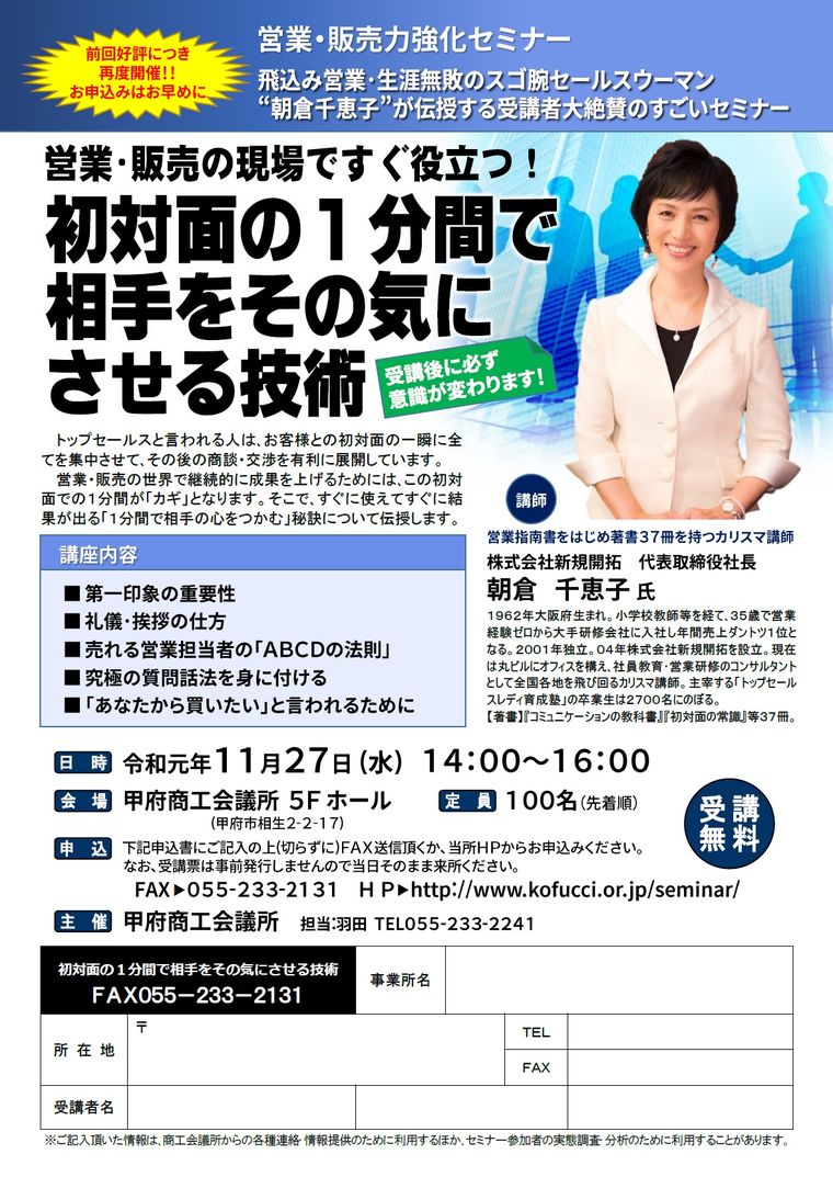 日時 2019-11-27 14:00~16:00 (終了) 場所 甲府商工会議所 講師 株式会社新規開拓 代表取締役社長 朝倉 千恵子 氏 参加費 無料 分野 販売促進 申し込み方法 申し込みフォーム、または資料の申込書を郵送・FAXにてお送りください。