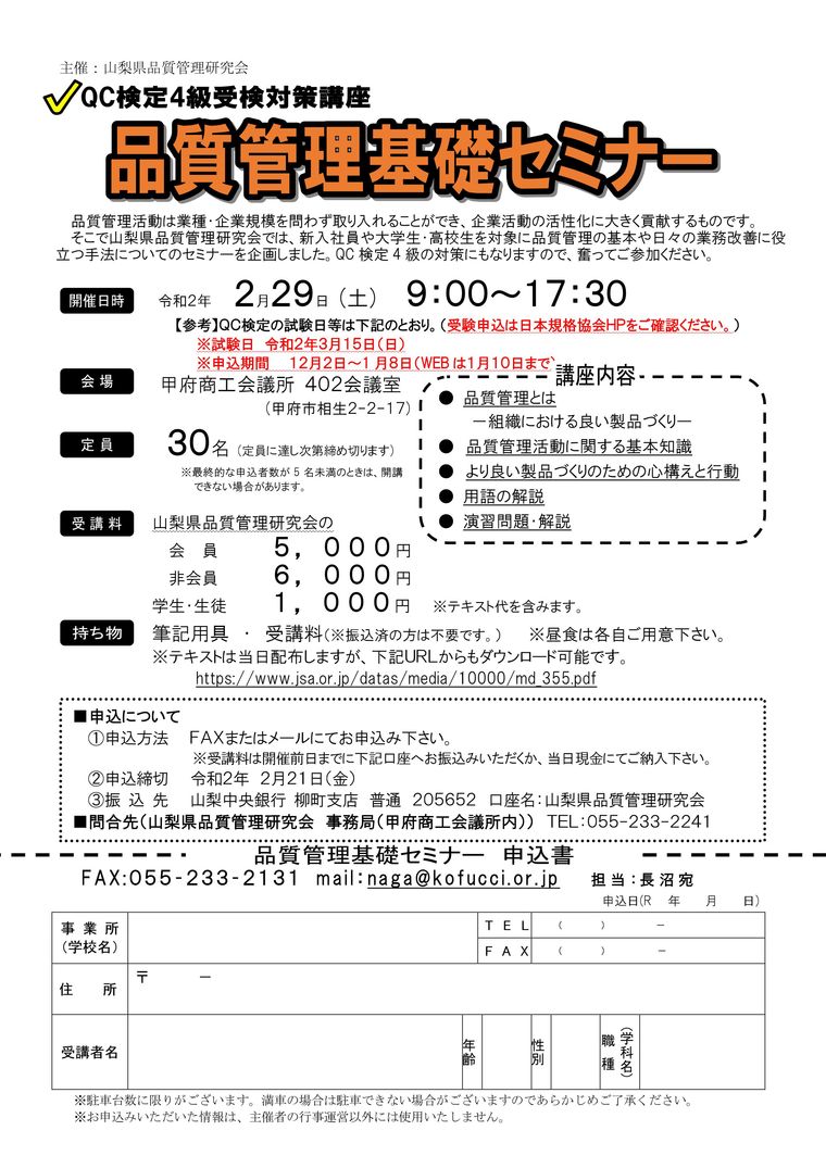 そこで山梨県品質管理研究会では、新入社員や大学生・高校生を対象に 品質管理の基本や日々の業務改善に役立つ手法についてのセミナーを企画しました。QC 検定4級の対策にもなりますので、奮ってご参加ください。概要
