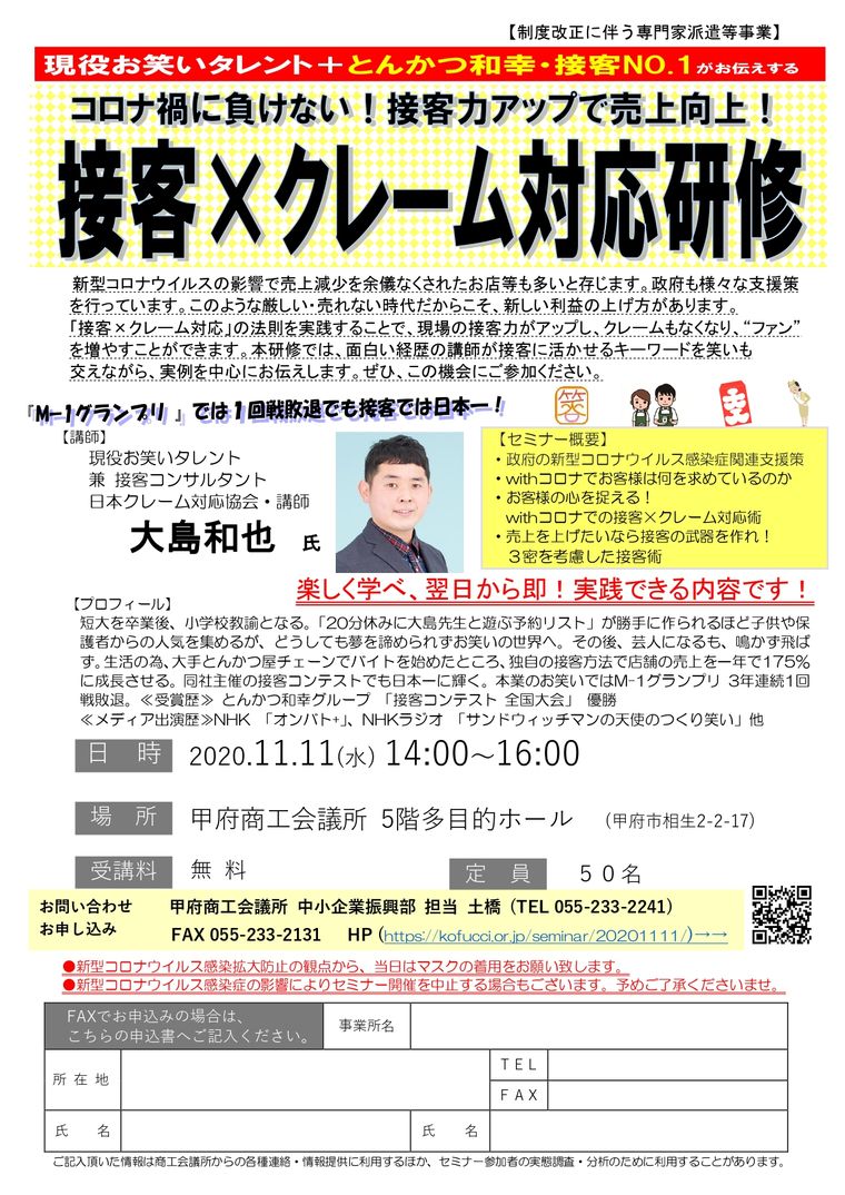 日時 2020-11-11 14:00~16:00 (終了) 場所 甲府商工会議所 多目的ホール 講師 現役お笑いタレント 兼 接客コンサルタント 日本クレーム対応協会・講師