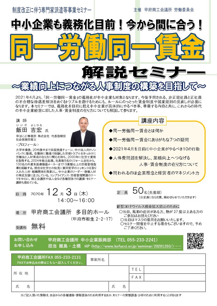 日時 2020-12-03 14:00~16:00 (終了) 場所 甲府商工会議所 5階多目的ホール 講師 孚事務所株式会社 代表取締役 飯田 吉宏 氏 参加費 無料 分野 労働 申し込み方法 申し込みフォーム、または資料の申込書を郵送・FAXにてお送りください。