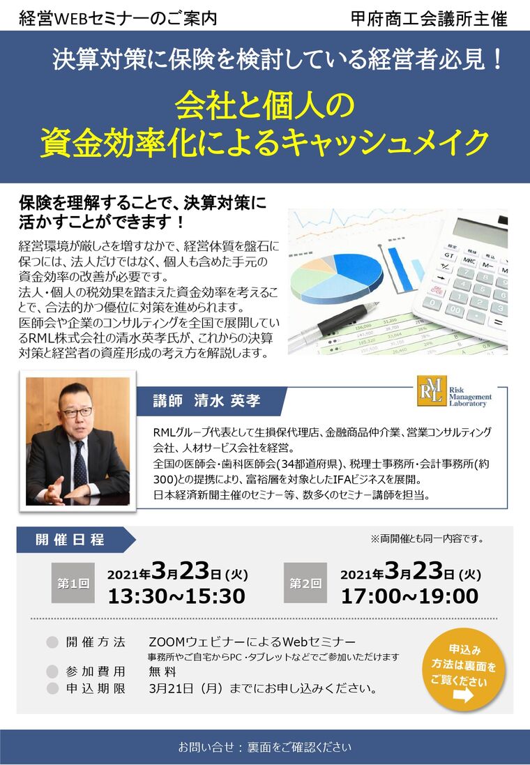2回目: 2021-03-23 17:00~19:00 (終了)場所 WEBセミナー(ZOOM使用) 講師 RML㈱ 代表取締役 清水 英孝 氏 参加費 無料 分野 経営 申し込み方法 セミナーへの申込は、チラシの裏面にありますURLもしくはQRコードより専用サイトにて行ってください。 お問い合わせ