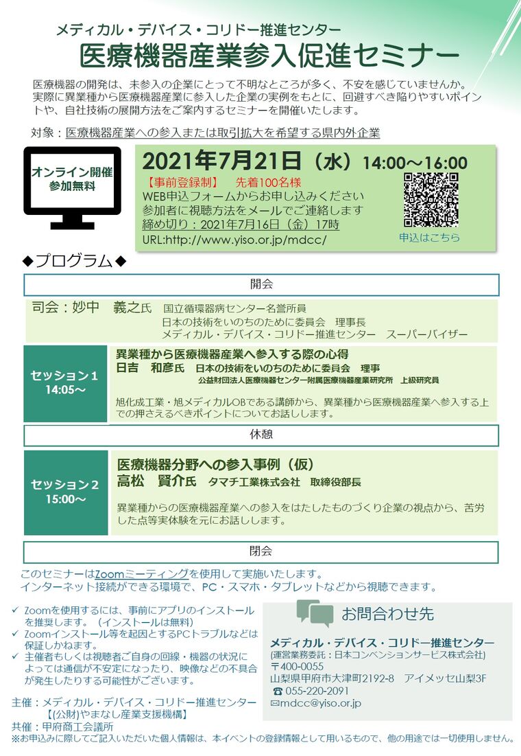 日時 2021-07-21 14:00~16:00 (終了) 場所 オンライン(ZOOM) 講師 セッション1:異業種から医療機器産業へ参入する際の心得