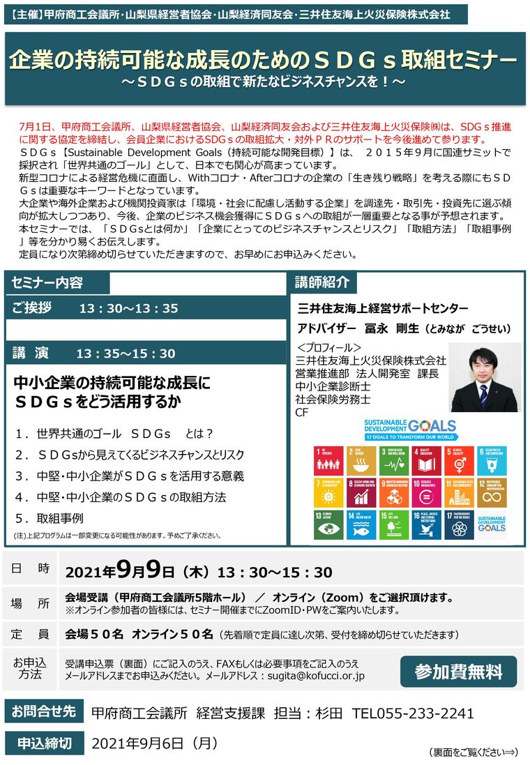 日時 2021-09-09 13:30~15:30 (終了) 場所 オンライン(Zoom) 講師 三井住友海上経営サポートセンター アドバイザー 冨永 剛生 氏 参加費 無料 分野 SDGs 申し込み方法 申し込みフォーム、または資料裏面の申込書を郵送・FAXにてお送りください。