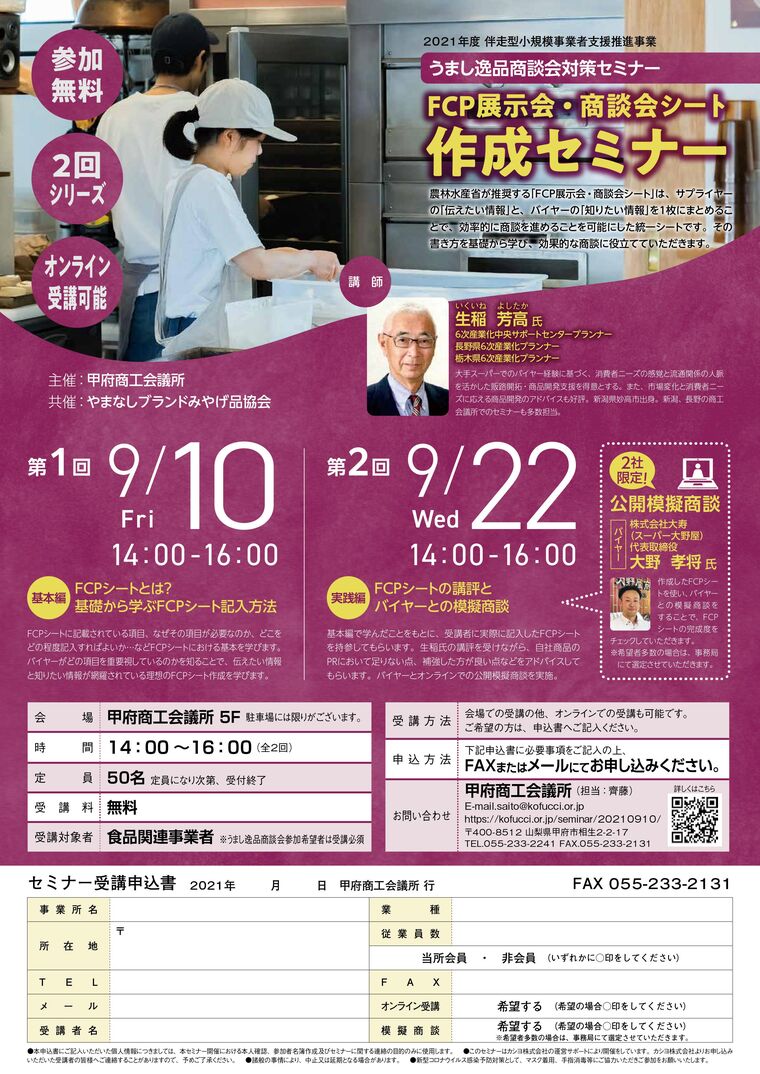 2回目: 2021-09-22 14:00~16:00 (終了)場所 甲府商工会議所 講師 6次産業化中央サポートセンタープランナー 生稲 芳高 氏 参加費 無料 分野 販路開拓 申し込み方法 申し込みフォーム、または資料の申込書を郵送・FAXにてお送りください。