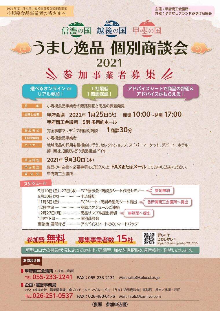 2015年から東京都内で開催されてきた、うまし逸品商談会(商談会主催企業:カシヨ(株))を甲府市で初開催します。本商談会では、地域に点在する魅力的な商品の新たな販路開拓を目的としております。参加バイヤーは、全国展開するスーパーや百貨店など商品のストーリー性に重きを置いたマーチャンダイジングを実施する企業を予定しております。