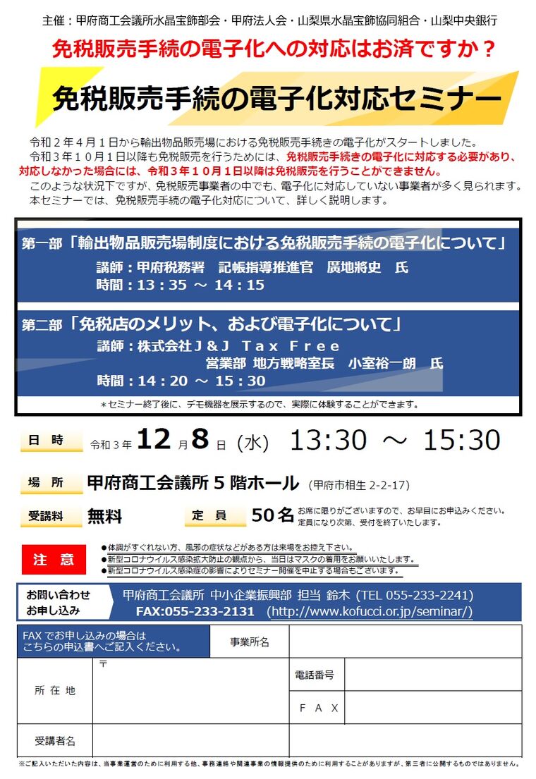 日時 2021-12-08 13:30~15:30 (終了) 場所 甲府商工会議所 講師 第1部:甲府税務署 記帳指導推進官 廣地將史 氏