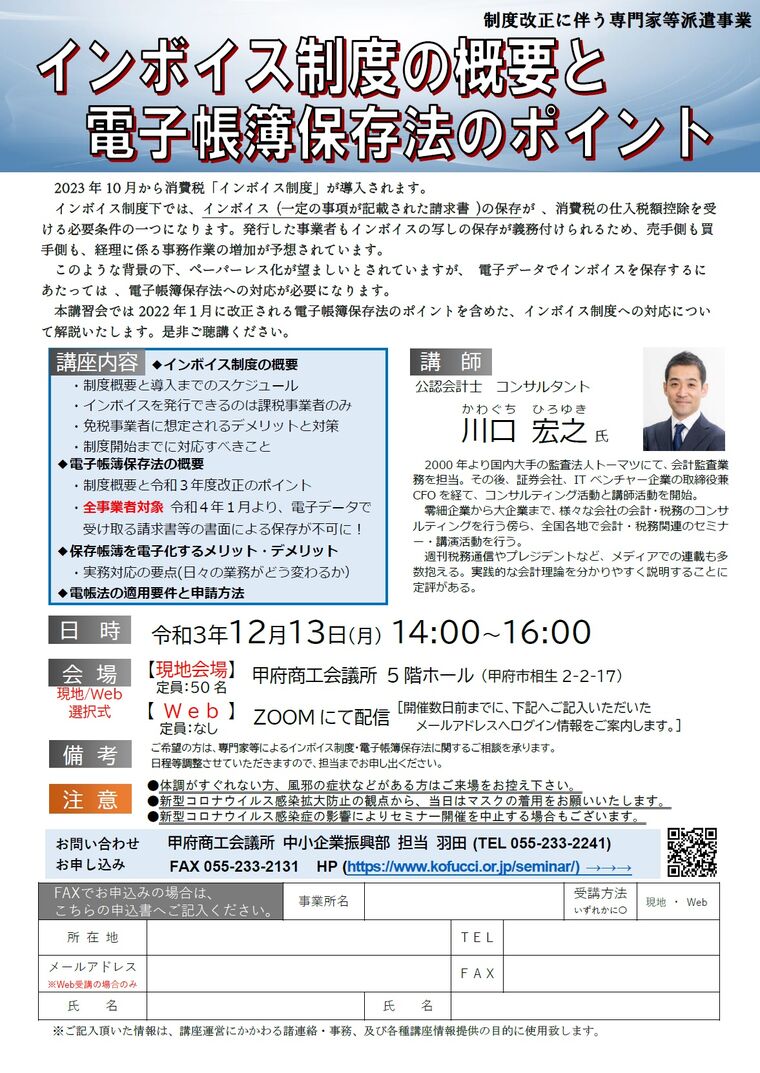 日時 2021-12-13 14:00~16:00 (終了) 場所 甲府商工会議所/Web 講師 公認会計士 コンサルタント 川口 宏之 氏 参加費 無料 分野 税務 申し込み方法 【お申込みフォーム】
