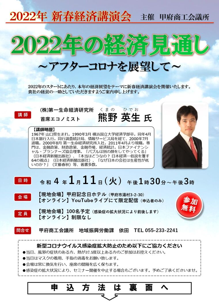 日時 2022-01-11 13:30~15:00 (終了) 場所 甲府記念日ホテル(甲府市湯村3-2-30) 講師 株式会社第一生命経済研究所 首席エコノミスト 熊野英生 氏 参加費 無料 分野 経済 申し込み方法 【お申込みフォーム】 お問い合わせ