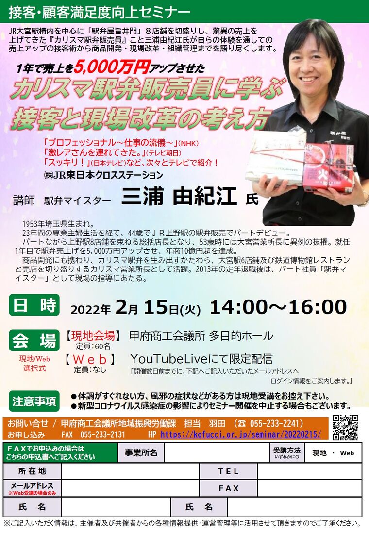 JR大宮駅構内を中心に「駅弁屋旨井門」8店舗を切盛りし、驚異の売上を上げてきた『カリスマ駅弁販売員』こと駅弁マイスター 三浦 由紀江 氏が自らの体験を通しての売上アップの接客術から商品開発・現場改革・組織管理までを語り尽くします。
