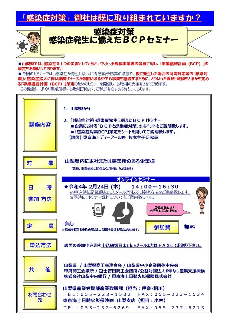 山梨県では、感染症を1つの災害としてとらえ、中小・小規模事業者の皆様に対し、「事業継続計画(BCP)」の策定を勧めております。