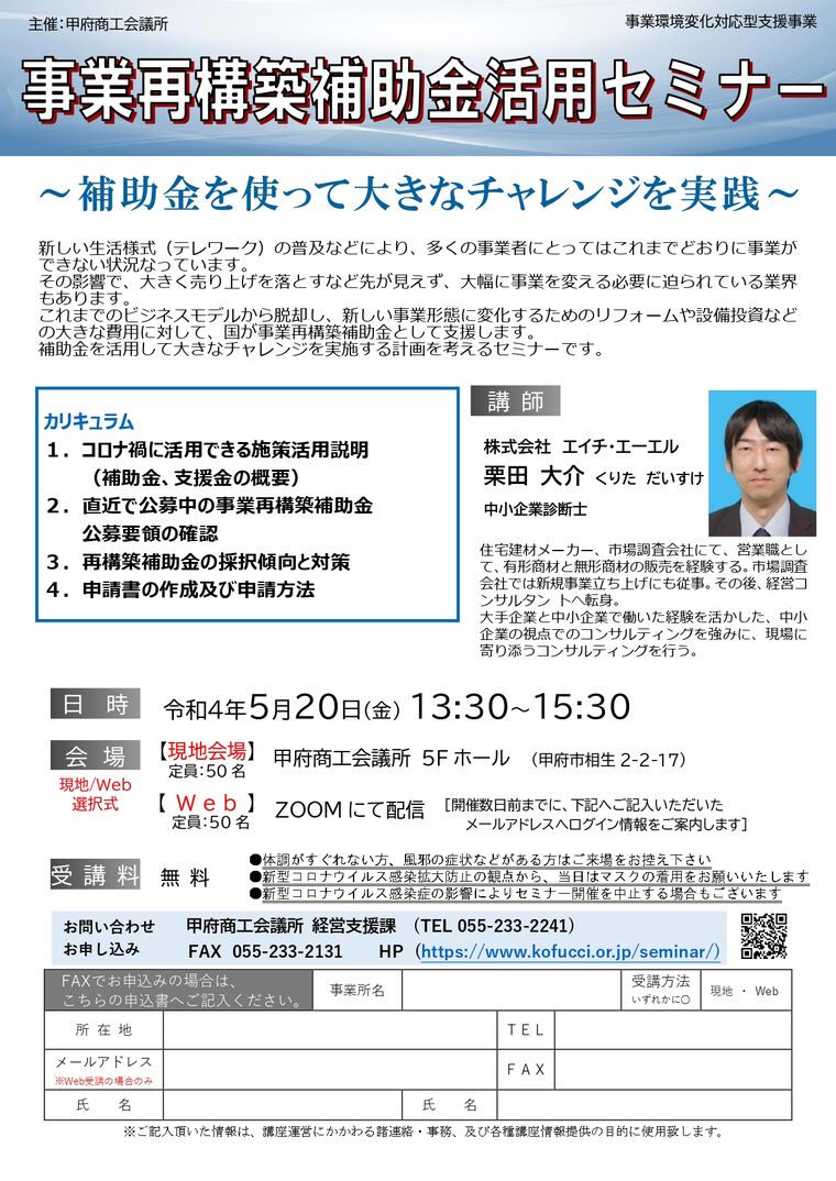 日時 2022-05-20 13:30~15:30 (終了) 場所 甲府商工会議所・オンライン(ZOOM) 講師 株式会社 エイチ・エーエル 中小企業診断士 栗田 大介 氏