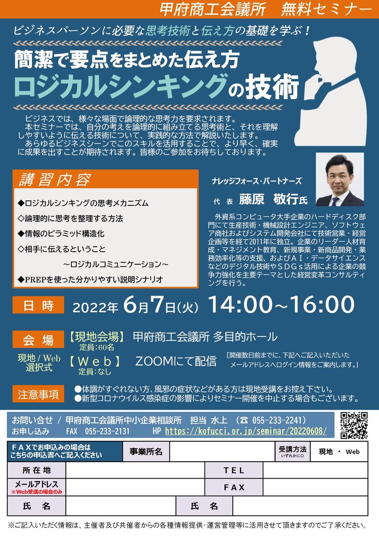 日時 2022-06-07 14:00~16:00 (終了) 場所 甲府商工会議所 5階多目的 または ZOOM 講師 ナレッジフォース・パートナーズ 代表 藤原 敬行 氏