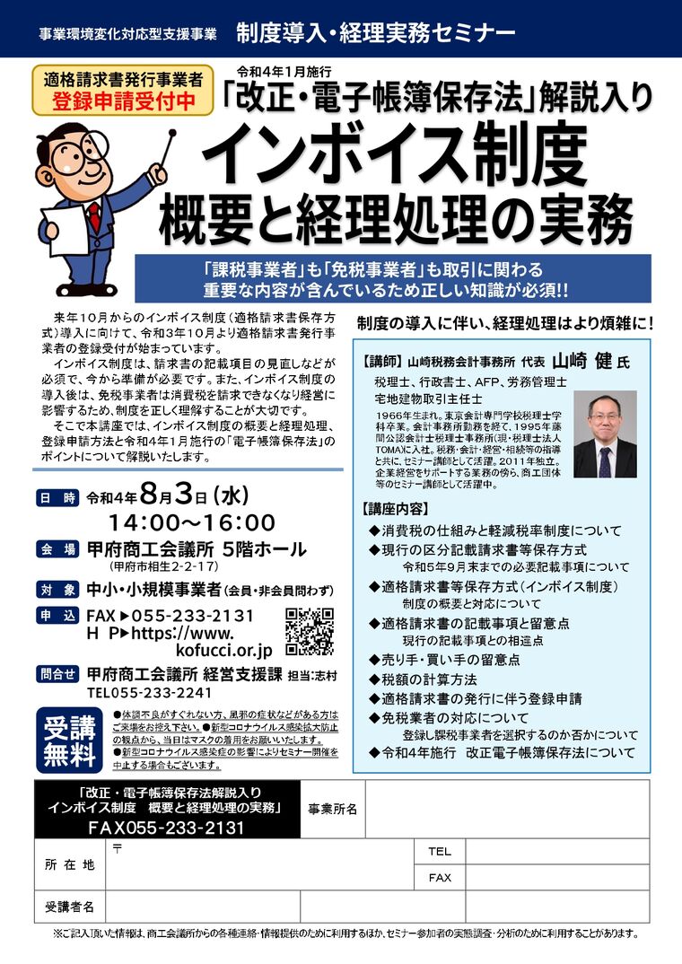 日時 2022-08-03 14:00~16:00 (終了) 場所 甲府商工会議所 5階ホール 講師 山崎税務会計事務所 代表 山崎 健 氏 参加費 無料 分野 インボイス 申し込み方法 【お申込みフォーム】※リンク先Googleフォーム お問い合わせ