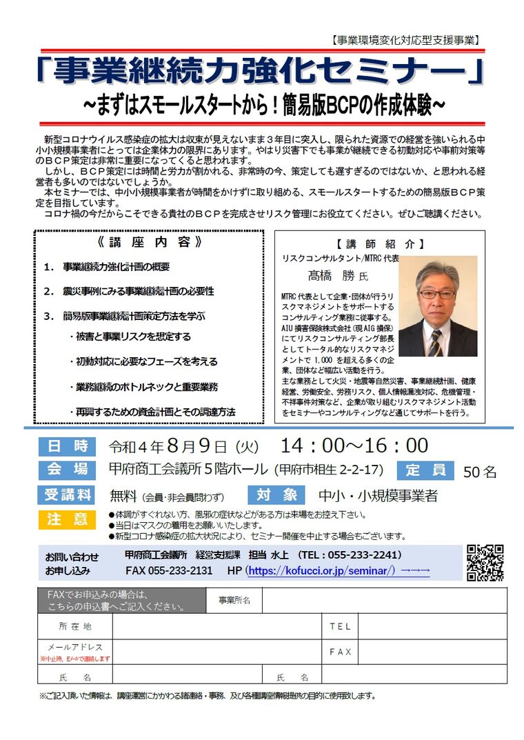 日時 2022-08-09 14:00~16:00 (終了) 場所 甲府商工会議所 5階 ホール 講師 リスクコンサルタント/MTRC代表