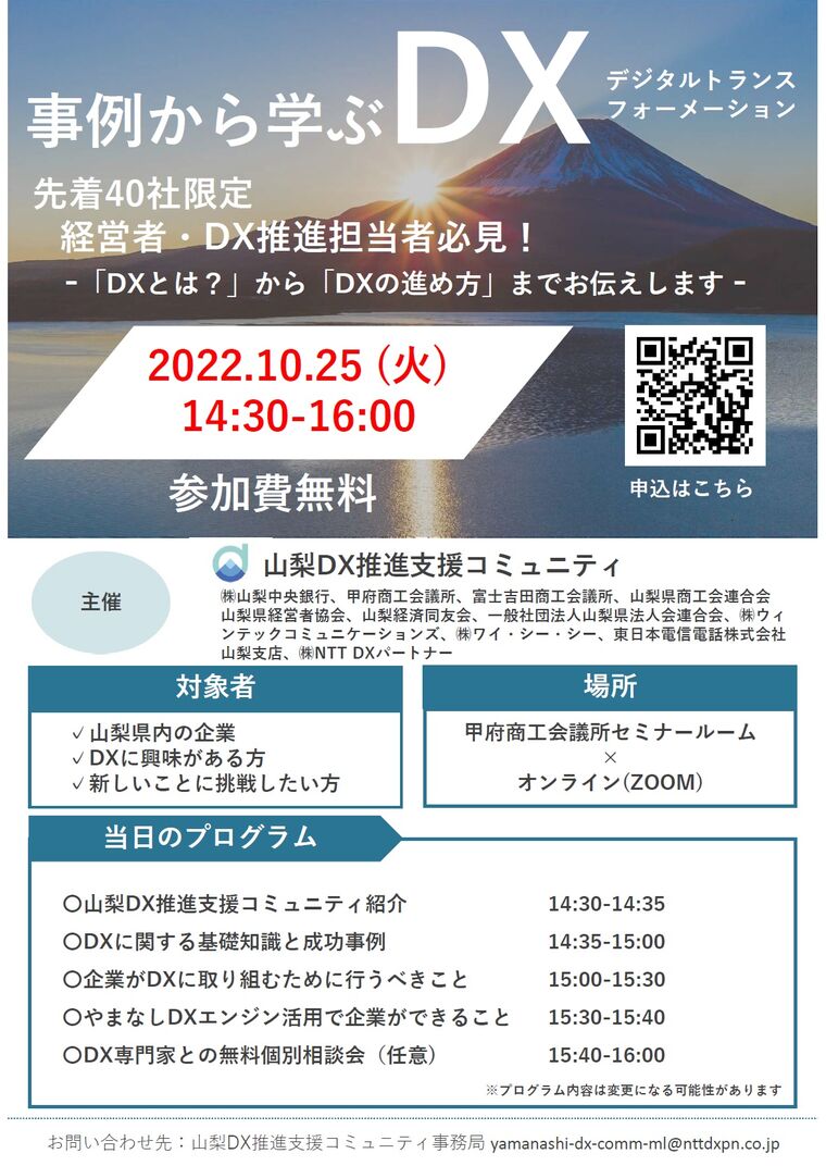 山梨県内の企業でDXに興味がある方、新しいことに挑戦したい方、是非参加をご検討ください。概要
