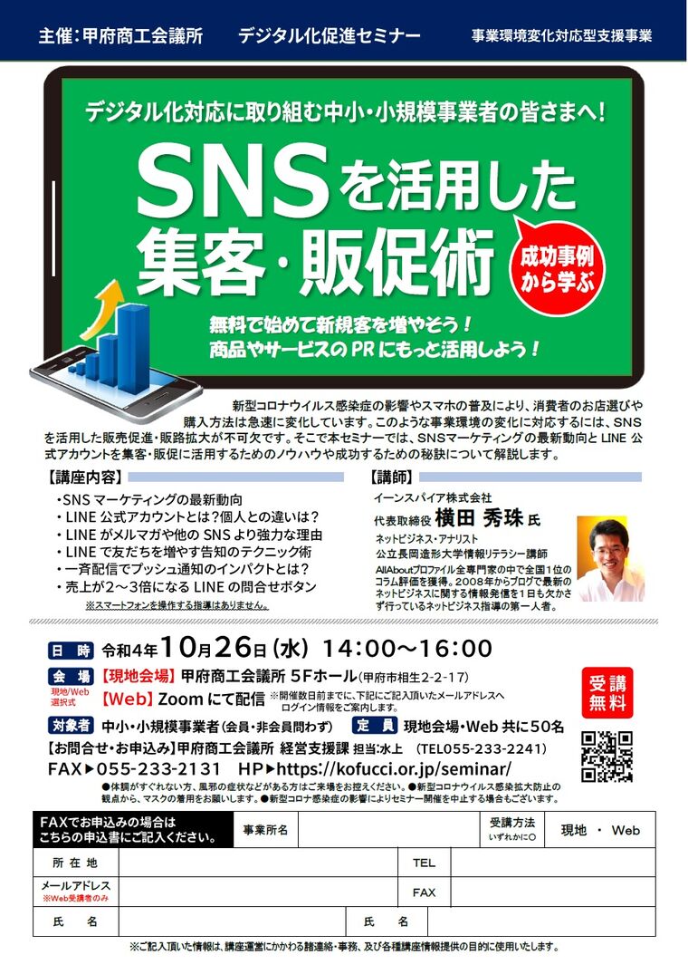 日時 2022-10-26 14:00~16:00 (終了) 場所 甲府商工会議所 5階 ホール 講師 イーンスパイア株式会社 代表取締役 横田 秀珠 氏 参加費 無料 分野 デジタル化 申し込み方法 お問い合わせ