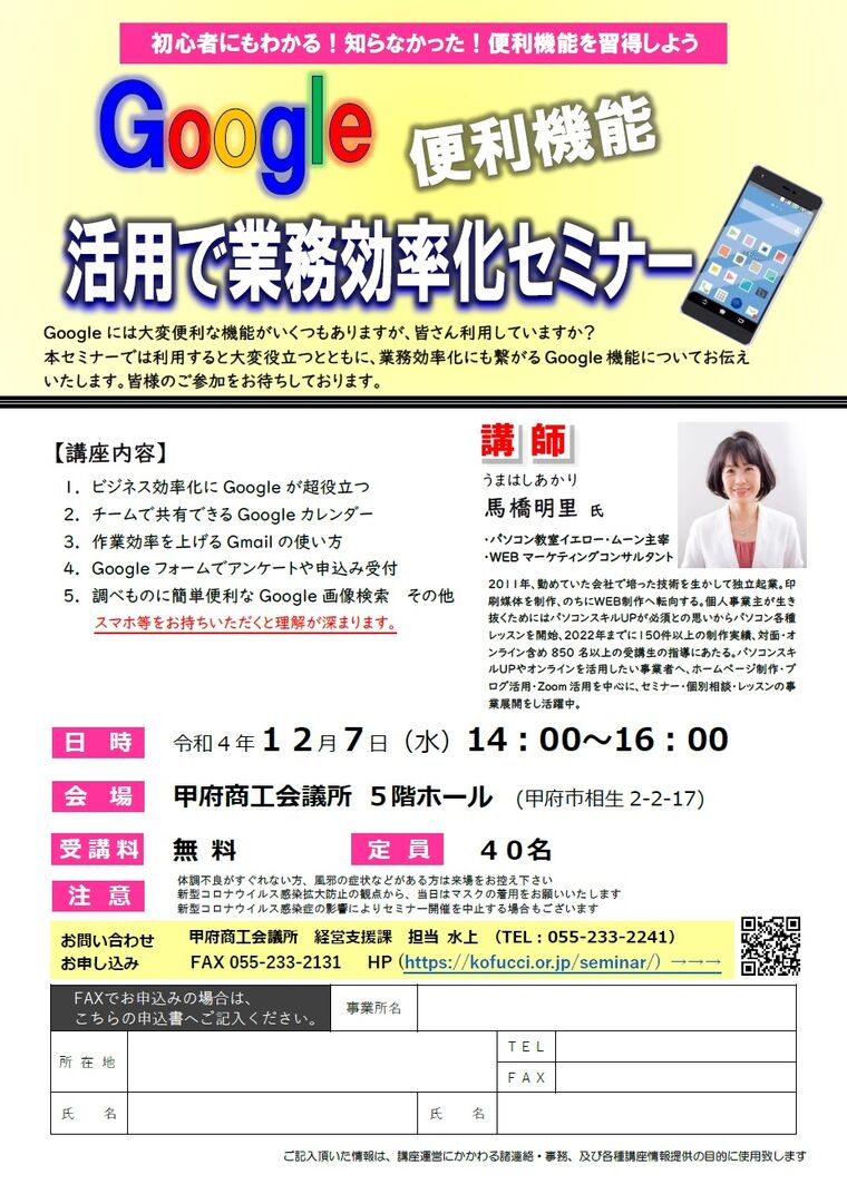 本セミナーでは利用すると大変役立つとともに、業務効率化にも繋がるGoogle機能についてお伝えいたします。