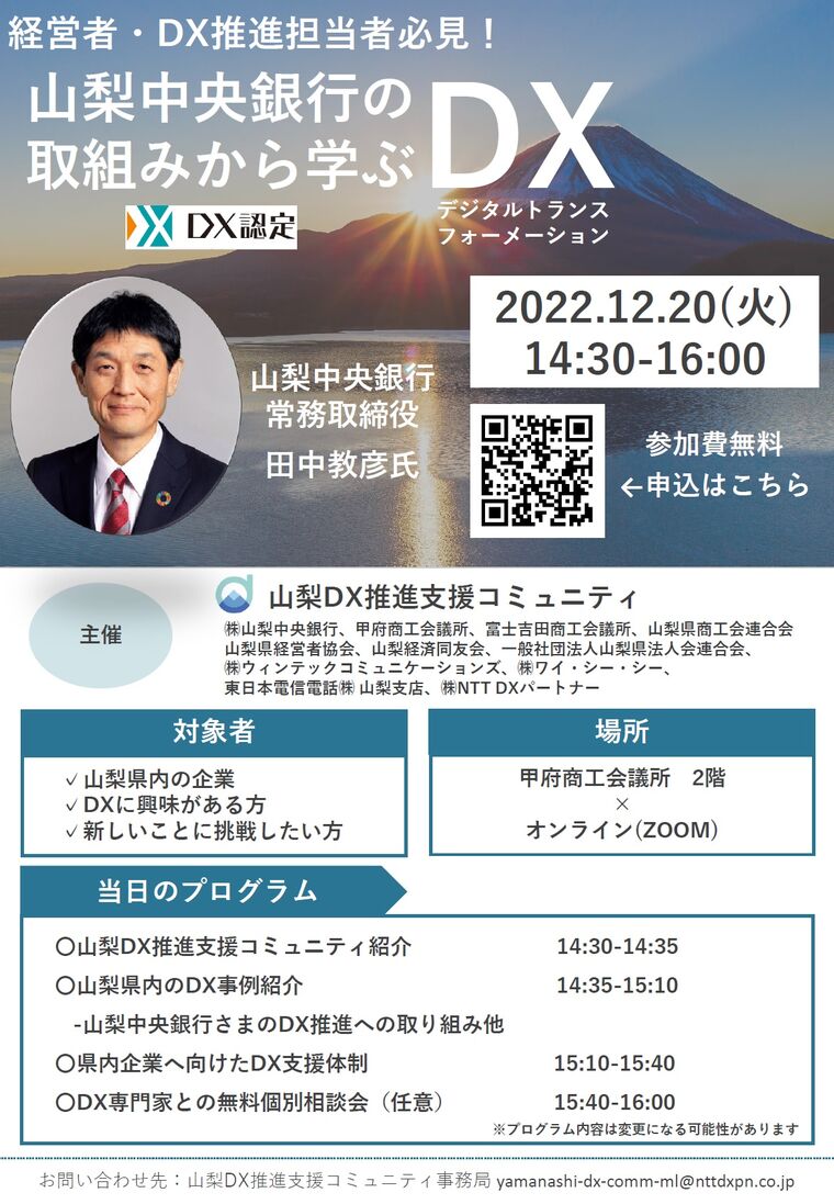 山梨DX推進支援コミュニティ参加費 無料 分野 DX/ICT 申し込み方法 申し込みはこちらから(やまなしDXエンジン) お問い合わせ