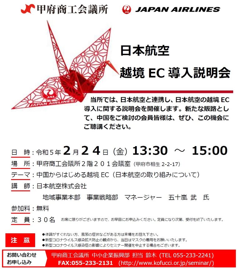 日時 2023-02-24 13:00~15:00 (終了) 場所 甲府商工会議所2階201会議室 講師 日本航空株式会社 地域事業本部 事業戦略部 マネージャー 五十嵐 武 氏